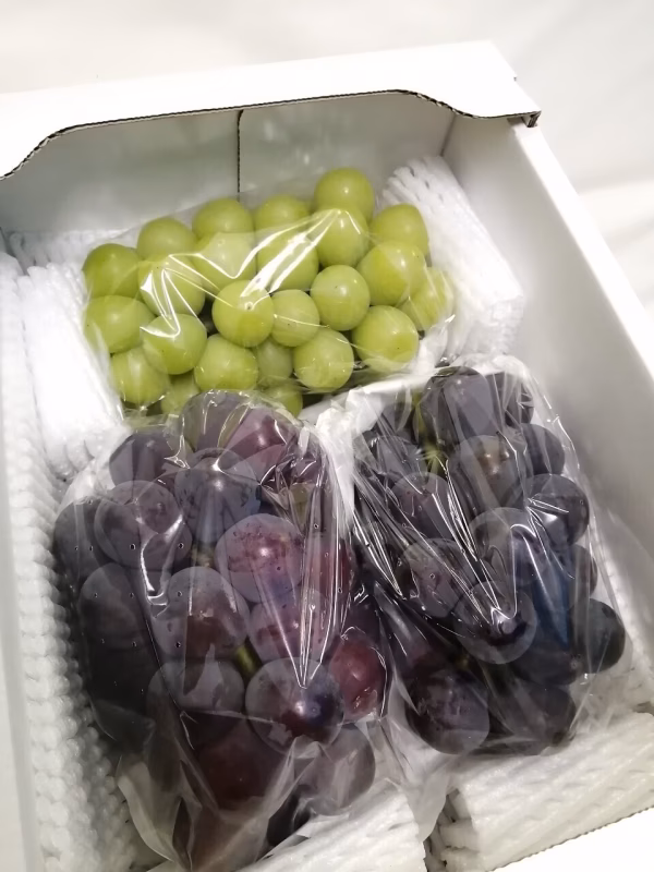 基本の組み合わせはシャインマスカット1房&ピオーネ2房、計3房(2kg)詰めとなります。
