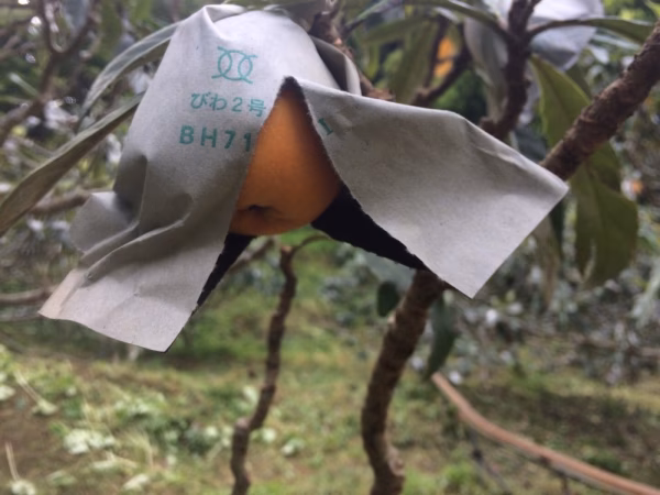 高級品のイメージが強いびわですが、熟してくると落ちやすく、霜、虫、鳥、傷などにより商品になるのは3割程度しかないため、どうしても高いものになってしまいます。少しでも価格を抑えたいので、収穫時の袋のままで販売しています。