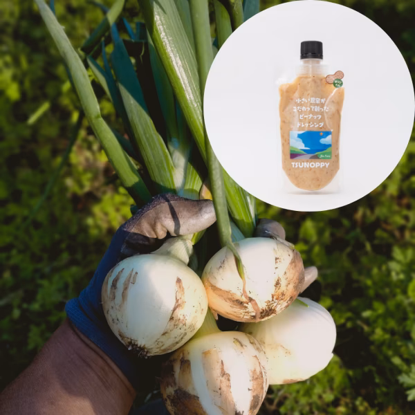 道の駅つので一番人気のオリジナル味のピーナッツドレッシング               & 農薬・化学肥料不使用で育てた新玉ねぎ(700g前後/5個) 新玉ねぎをスライスして、鰹節とピーナッツドレッシングをかけると最高に美味しい!のセットです(限定20セット) 葉付き新玉ねぎは、玉ねぎ部分はサラダで、葉の部分もネギとして使えます、到着後は葉の部分は切り離して保存してください ■商品概要 ピーナッツ<都農町産>の栽培から加工まで素材の味を大切にした体にやさしいこだわりのドレッシング。健康志向の方にピッタリ。農薬・化学肥料・除草剤不使用で環境にも配慮して育てました。 じろう畑で収穫したピーナッツを使った加工品に【TSUNOPPY】のラベルで販売しています。 ラベルの絵は、都農町の畑から見える海と山の稜線、そしてワイン畑。ワインのラベルのテロワールを意識して描きました。 TSUNOPPY(つのッピー)は、宮崎県都農町のじろう畑で栽培された落花生で作った商品シリーズです。他にも、ピーナッツバタースムースとチャンクも販売中! オリジナル味・・・レモンの爽やかさとピーナッツのコクと旨味が特徴のドレッシング、サラダにはもちろん、宮崎特産の地鶏の炭火焼きなどの肉料理にも、ピーナッツのコクとレモンの相性がいい。焙煎したナッツの粒も入っているので、ちょっと贅沢なサラダになります。 ■2種類のピーナッツをブレンドしています マルシェなどで自家製野菜を贅沢に使ったサラダボウルにピーナッツドレッシングを入れて販売してますが、多くの方が”ピーナツのコクが濃厚”と言っていただけてます。味と香りの良い地落花生と油分の多い落花生の2種類の素材のピーナッツをブレンドして、ピーナッツ由来以外の油分を極力使わずに創ることが出来ました。 ■農薬・化学肥料・除草剤不使用で栽培しています。しかも・・ じろう畑は、人にも自然環境にも優しい、永続的な栽培を目指しています。だから、農業資材などのビニル製品は極力使用しません。肥料等も家畜排せつ物に由来する堆肥などを使用せず、草や落ち葉、カキ殻、バイオ炭等、地域で循環するものや緑肥を利用しています。すべて人の手で出来る範囲で丁寧に育てています。秋に収穫したピーナッツは、植える種だけ残して、収穫出来た量だけを加工して販売しています。 ■落花生が繋がったまま畑で天日でゆっくり乾燥 落花生が繋がっている紐をすぐに外さないのは、幹の栄養が最後まで実に届くように、そして、急激に乾燥しないようにします。土から掘り上げて大体1週間程度畑の上で乾燥させてから、ボッチ積みにしてしっかり乾燥させます。鳥や鹿に食べられないよう、雨風で濡れないように、乾燥にはとても気を使います。乾燥が終わったら、専用の脱粒機で鞘を外していきます。 ■みんなの支えで出来ているピーナッツ栽培、おいしい食べ物は、人と人を繋ぎます。 じろう畑には、農作業を手伝いながら一緒に生活するWWOOF(ウーフ)という、ボランティアワーカーの人や地元サッカーチームの選手たちが手伝いに来てくれています。農作業は沢山の人と一緒に汗を流すと、一つのチームになって作業も捗り、早く楽しくすることが出来ます。終わったときの充実感はとても心地良いです。 そんな中から、いろんなアイデアも出てきて、ついに出来たのが、DIYで作ったピーナッツ殻割り機。ピーナッツの材料調整が劇的に早くなりました。(新聞にも載りました。) https://poke-m.com/posts/842226 ■農場に加工所があるメリット 美味しい作物をずっと作り続けて、環境も社会も良くしていきたいという想いを叶える為に、食品加工所を作る決断をしました。加工所があると季節の野菜や果樹などを一次加工品として、新鮮なうちに加工保存できたり、ちょっとしたレシピの変更など臨機応変に少ロットでも対応することが出来ます。マルシェなどでの直接販売で、お客さんと直にお話する機会なども増えて、野菜や加工品のストーリーをお伝えすることがとても嬉しいです。 ■数量、分量の目安 オリジナル 150ml入/袋 ■注文に際しての注意点 クリックポストでお届けします。 配送は、直接ポストへ投函されます。 ■簡易包材について 材料の調達から製造方法、包材の選択など、環境に配慮した加工品づくりを考えています。 包材についても、安全に長期間内容物の品質を保ち、何が環境負荷が少ないのかを考えた結果、カウパック株式会社の軟包装パッケージを選択しました。ガラス瓶は天然のもので作られてるので、良さそうに思いますが、製造時のエネルギーや重量があるので輸送時のエネルギーを考えると、ワンウェイ(一回限り)での使用は、より環境負荷が高いと考えました。 しかし、プラスチックの軟包装パッケージがすべて解決できるかというと、マイクロプラスチックや石油資源などいろいろ問題があります。 軟包装パッケージは、ごみの減量化・プラスチック使用量削減・再生可能原料(バイオマス)を使用、