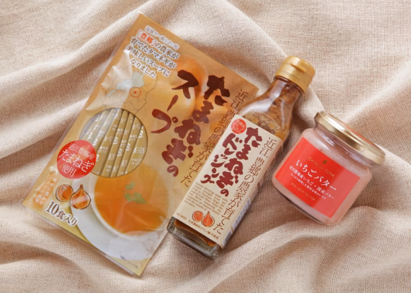 滋賀県豊郷町の市川農場の自社農場で栽培された、いちごを使った【いちごバター190g】と同じく自社農場で栽培した、たまねぎを使った【たまねぎドレッシング200ml】と【たまねぎスープ6g×10食入】をセットにしました。