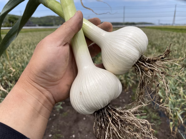 今年も「生にんにく」の解禁の時期が迫りました! 収穫後すぐに乾燥工程に入らないといけないため生にんにくは超期間限定での販売となりますことをご了承くださいませ。 <味> 乾燥にんにくとは異なるマイルドな香りと新鮮な食感。 乾燥にんにくとの違いをこの機会に是非感じてみてください。 個人的には素揚げ・天ぷらなどオススメです。 <こだわりポイント> 慣行栽培ですが農薬は通常の1/2、肥料は化学肥料を削減し有機堆肥を通常の2倍施用して栽培しています。 収穫後、厳選したものを発送いたします。 <梱包> 出荷時はおおよそ1玉100g~130g(L~LLサイズ)のものをネットに入れて発送になる予定です。 500g(1ネット)×ご注文量を段ボールに入れて発送いたします。 ※1ネット4,5玉になります。 ※販売時期(収穫期)は現時点での予定となります。 5月以降順次収穫、発送を予定しております。 時間指定は可能ですが日付指定は承れませんので、予めご了承ください。