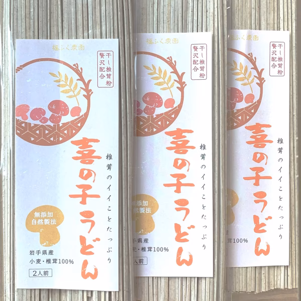★新発売★ 『喜の子うどん』 椎茸約6個分の旨みが生きた、塩分控えめでも深い味わいのうどんです。 ▼数量、分量の目安   200g入り(2人前)× 3袋 ▼商品概要 『喜の子うどん』は、岩手県産の小麦粉と、福ふく農園自慢のしいたけパウダーを贅沢に使い、うまみをぎゅっと閉じ込めた特製うどんです。塩分はできるだけ控えめにし、素材の味を最大限に引き出しました。噛むほどに広がるしいたけの自然なうまみと、小麦本来の風味をぜひご堪能ください。自然乾燥で仕上げたコシのある麺は、ご家庭の食卓をちょっと贅沢に彩ります。 乾し椎茸に含まれる栄養成分 •食物繊維 •ビタミンD •エリタデニン •グルタミン酸 •グアニル酸 冷たいざるうどんや温かいかけうどん、天ぷらうどんなど、季節に合わせて多彩なアレンジでお楽しみいただけます。 椎茸が苦手な方にも、うどんを通しておいしく栄養を取り入れていただける一品です。 日常の食卓に、ほっと心を休めるやさしい味わいをどうぞ。