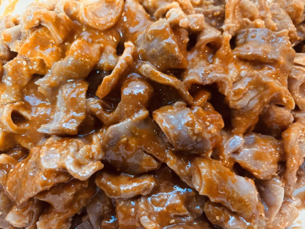 そこに、自家製のタレ(焼き肉味風)を絡めた老若男女問わず親しまれる味に仕上げました。