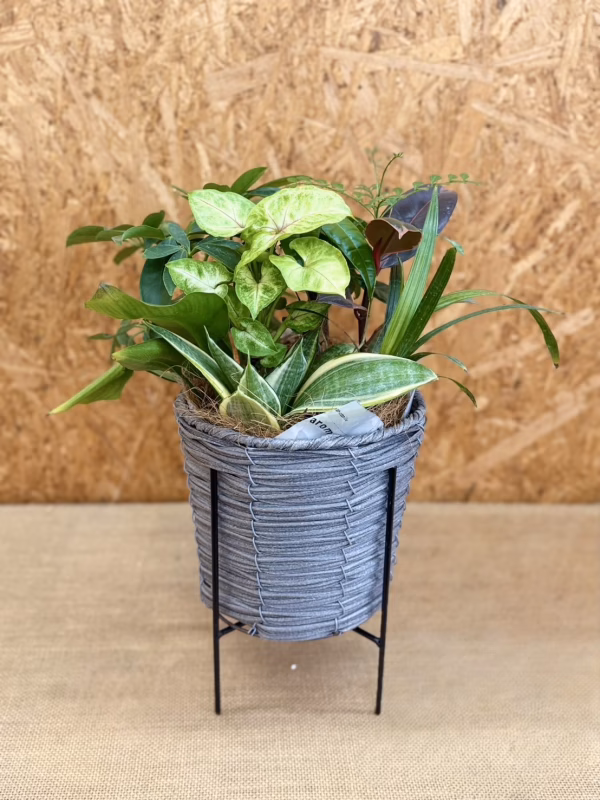 スタンド付きのシックなデザインのバスケット容器(5寸)を使っております。カゴの素材も水に強い素材を使用しております。