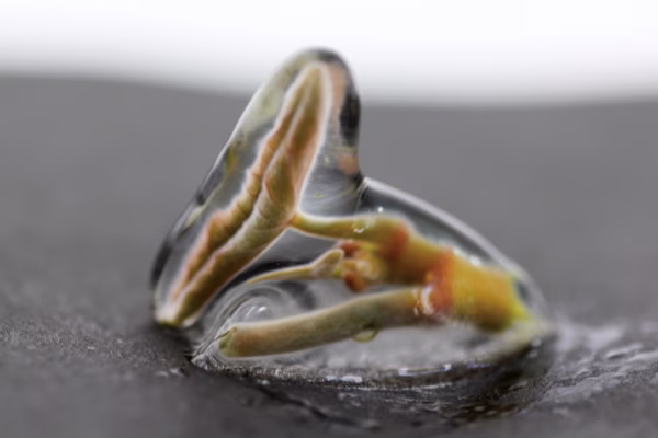 じゅんさいは水面に葉を浮かべる水草の一種です。じゅんさい畑の水深は約80cm~1mほど。底に根を張り、そこからたくさんの茎を伸ばし緑色の楕円形をした葉を水面に浮かべます。水面に顔を出す前、水中の若芽の状態のものを食します。じゅんさいは水中で害敵や病気から身を守るためにバリアーとしてゼリー状のマクで身を包んでいます。そのゼリー質が最高に美味なのです!!