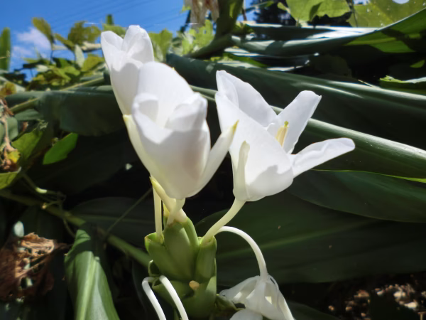 草丈が80~100センチになり、大きな葉と白い花が南国を思わせる姿で葉も香り豊かです。
