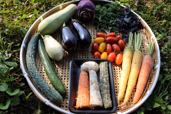 現在お届け可能な野菜:きゅうり、ズッキーニ、キャベツ、ヤングコーン、とうもろこし、ミニトマト、中玉トマト、ビーツ、ナス、ピーマン、万願寺とうがらし、パプリカ、じゃがいも(きたあかり、アンデスレッド、メークイン)、コリンキー、バジル、青紫蘇