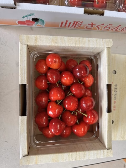 【紅秀峰】は、佐藤錦と比べて大粒で、果肉が硬く歯ごたえがあり、酸味が少なく糖度が高い寒河江市生まれのさくらんぼです。