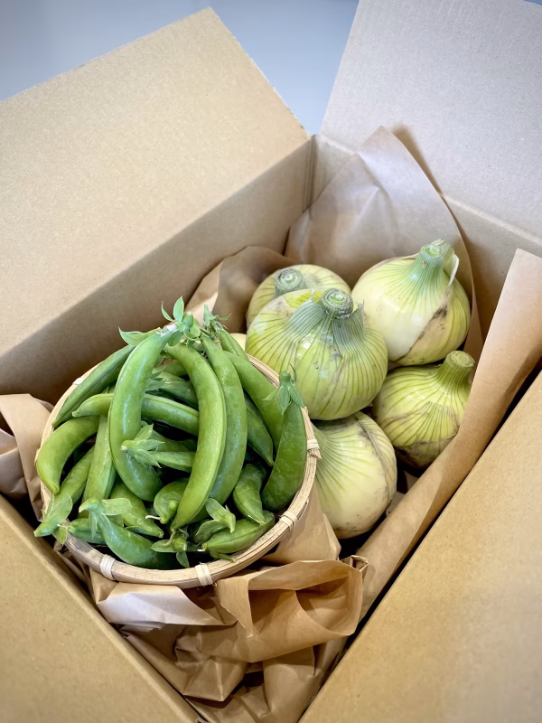 収穫期間の短いスナップエンドウと採れたての新玉ねぎです。