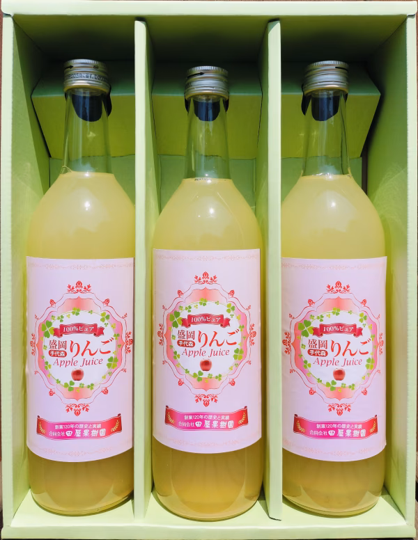 盛岡でも、日照時間が長く、水はけも良い手代森地域で育ったりんごを皮ごと絞りました。ワインの様なオシャレな形のビンですので、贈り物にもピッタリです。