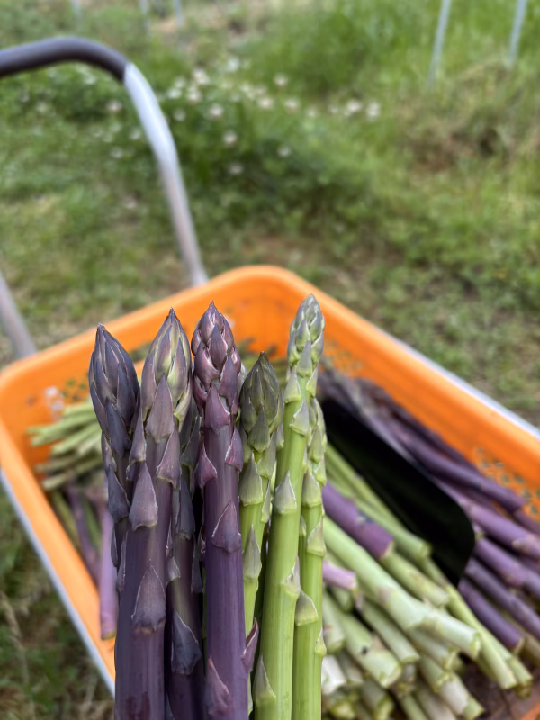 通常のアスパラガス栽培のほとんどは、牛糞堆肥を畝上に多量散布し圃場含めて草を生やさないようにしますが、当農園は、アスパラ農家としては、珍しく2022年から動物性堆肥は不使用に切り替え、あえて適度の草を生やして、適度に刈ってそのままマルチにしたりと、雑草と共存するように栽培してます。草取りは手間が増えますが、メリットも大きいので、クローバーの草や綺麗な花も咲いてる環境にしてます。なので、