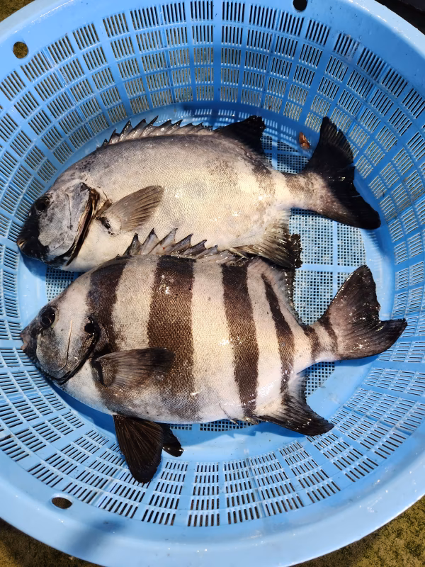 定置網に入っているイシダイを1匹ずつ丁寧に魚層に活かし港に帰港後、活〆、血抜きし、その日に出荷。