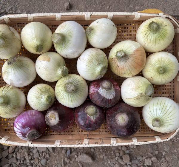 収穫したばかりの新タマネギは、新鮮そのもので甘みが強く、みずみずしい味わいはスーパーの玉ねぎとは一味違います!