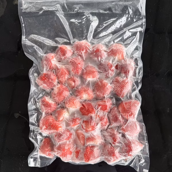ていねいにヘタを取り、最適な真空状態のパックに詰めて、専用の液体急速凍結機で凍らせるため、通常冷凍に比べて食べた時の食感は滑らかで、いちごの香りが摘みたての香です。
