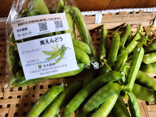 2月の厳しい寒さに耐え、3月からすくすく成長し、豆がよく膨らんだ実えんどうです。