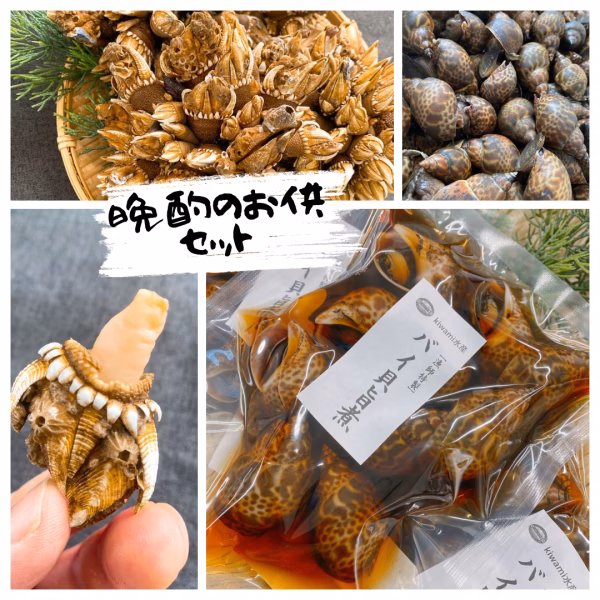 浜名湖産天然カメノテ塩茹でと甘くコリっとした食感のバイ貝旨煮の晩酌のお供にピッタリのセットです。