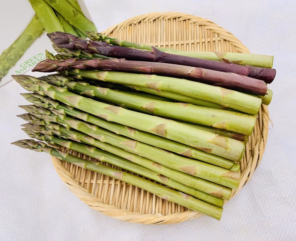 グリーンアスパラに紫アスパラを数本一緒にお詰めしました。朝早くに収穫したアスパラをクール便にてお届けします。