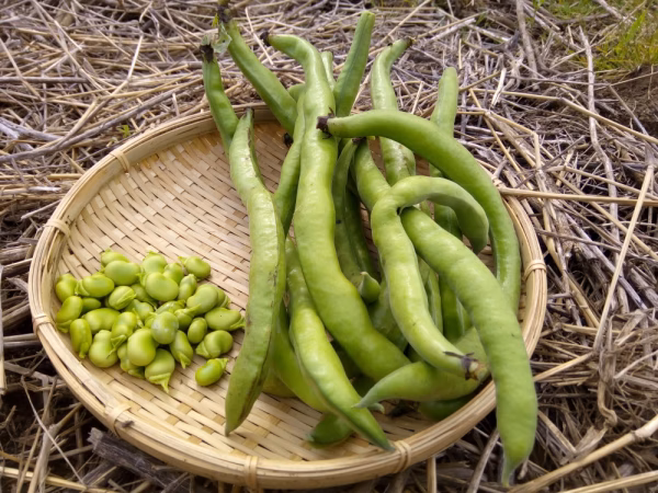 千葉県南房総産のイタリアソラマメ、ファーべです。長いさやは30cm程度にもなり、中にはやや小粒の豆が6〜8くらい入ってます。エグミが少なく食べやすいファーべは本場イタリアでは白ワインとチーズと一緒にいただくことが多いとか。地方によっては若いものを生食することもあるそうです。