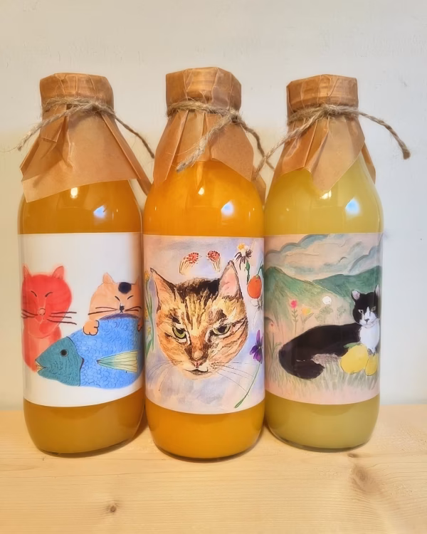 ジュースは左から八朔、青島みかん、ニューサマーオレンジです。どれもストレートジュースになります。