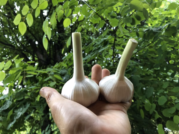 今年は堆肥と鶏糞だけの有機栽培で育てました。農薬は畑の周辺や作物へ全く使用せず、食用の酢と唐辛子と重曹の噴霧で害虫と病気から何とか守り切りました。生で食べてもとても美味しい自慢のにんにくです。