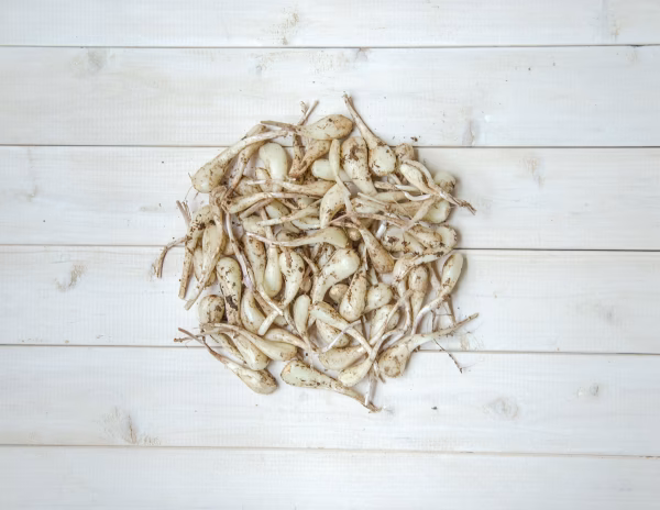 らっきょう本体の部分が約5cm程度、根を約1cm程度残した状態に調整しております。