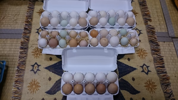 →春になり巣箱が混雑し、まれに巣箱以外のところに産んでしまうときもあります。すぐに回収するように努めておりますが、やはりそんなものも出てしまいます…