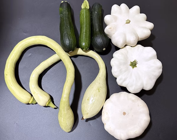今年もズッキーニを栽培しましたので、販売を開始しました! 今年は4種類を植えました! 種類は以下です。 ●カスタードホワイト(ヴェールぺタル)・・・白(緑)の花型(UFO型) ●ゼルダ・・・通常のズッキーニで色が、濃い緑。 ●ブラックズッキーニ(ダークヤングマン)・・・通常のズッキーニで色が、黒。 ●トランペットズッキーニ・・・下部が膨らんだトランペットのような形か、輪のように丸く曲がっている。細長く30-50cmくらいの大きさ。                曲がり方が大きすぎると、箱に入れられない場合があります。 これらが生育の状況に応じて入ります。 (偏りがあるかもしれません) 是非、食べ比べてみてください! おかげ様で農薬・化学肥料不使用で育ちました。 花型は、中をくり抜いて、ミートソースやチーズなどを詰めて、 オーブンで焼いて食べると美味しいですよ。 家族へは、フリッターが好評でした。 他にも、ナムル、ソテー、酢漬け、ステーキなどなど色々できます。 環境への配慮として、梱包は簡易的な紙のみになりますので御了承ください。