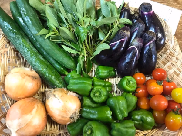 きゅうり2本 ズッキーニ1本 茄子3本 タマネギ2個 ピーマン100g(5~6個) ミニトマト100g(5~8個) 大玉トマト1個 空心菜 葉野菜 にんにく