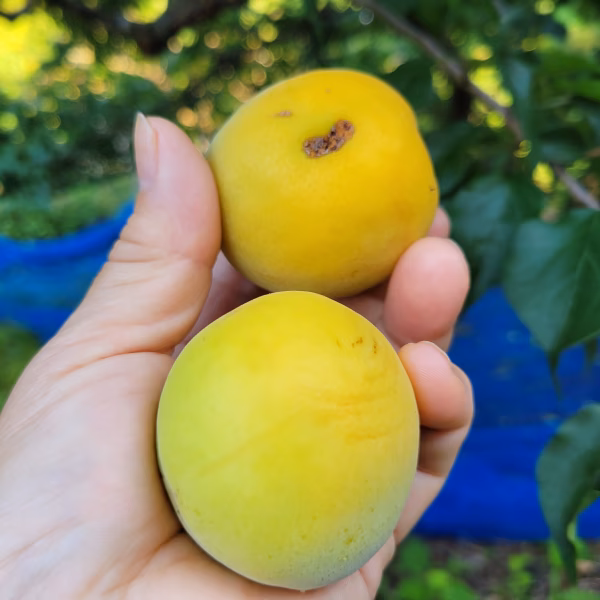 今年は、もう採れないと思っていた 貴重な5Lサイズの南高梅 少しだけ採れました。雹に当たっているので、当たり印がついています。