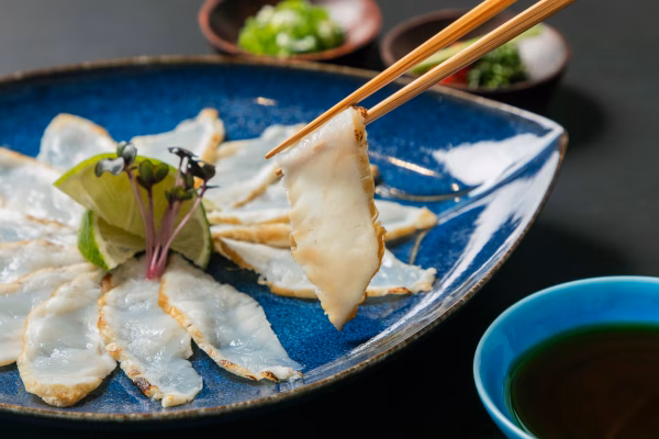 とらふぐの身を藁焼きにした“たたき“のお刺身。