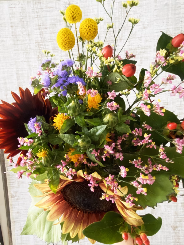 夏のガーデンから届いたような、カラフルでにぎやかなブーケ(お任せになり、写真と少し異なることがあります。)クラスペディア、紅花やスターチス、ヒペリカムなど、色も形もバリエーション豊かで見ていて飽きないお花ばかり。どこに飾っても目を引く明るさで、お部屋がぱっと華やぎます。 ナチュラルだけどちょっとポップな雰囲気も、このブーケの魅力です♪ 何が入るかはおまかせですが、その日の一番きれいをお届けします✨ 自分用にも、大切な人へのサプライズにもおすすめです♪ お花を飾ることで、いつもの生活が彩りあふれる暮らしとなりますよう願いを込めて、お届けいたしております。どうぞよろしくお願いいたします。 ★★★★★ ご自宅以外へ贈りものとして送られる場合は、簡易ラッピング(リボン付き)になりますが、プレゼント🎁にも対応可能です。事前にコメントをくださいね。 ★★★★★ #自己紹介 はじめまして、花ランドの浜田です。 香川県の田舎で妻とお花の多品種生産農家をしています。ご自宅用はもちろん、大切な人へ贈りものやあなたの気持ちを伝えるお手伝いをさせていただきます! #こだわり ①花ランドでは多品種の生産をし、ほとんど農薬を使わない自然農法にこだわり、季節に応じて旬の花をメインにお届けします。 ②直接、花畑から採取して、配送前の事前の水上げも施して新鮮なお花をお届けします。 ③生産者から直接に販売のため花市場より利用者に安くお届けできます。 ④生産者の顔がみえる販売方法のため、安心していただけます。 ⑤妻は花屋の娘だったこともあり、単品はもとより、いろいろ組み合わせてのブーケや花束、プレゼント用のラッピングも可能です。お花だけの配送も、できるだけ新鮮を保つ方法でなおかつ丁寧な梱包に心がけています。プレゼント用は簡易的にリボンをおつけして配送します。事前に伝えてください。 ⑥延命剤をお付けしております。花瓶に水の後に入れてください。お花が長持ちします。 #お花のお手入れ お花を長く楽しんで頂くためには、下の余分な葉っぱを花びんの水につけないように取ってもらう、また、霧吹きや延命剤を入れると、長くお花が持ちます。 ※生花につき、北海道、沖縄、離島などへの配送日数がかかるために取り扱いしておりません。申し訳ありません。 保存方法水をこまめに入れ替えてください。直射日光が当たる場所は控えてください。