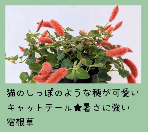 赤い猫のしっぽのような穂が着く植物 耐暑性宿根草で生育できる温度があれば通年栽培可能 這うように成長するのでハンギングや鉢植え 寄せ植えなどに使うと可愛らしい 暑さにはとても強く夏の間、赤い穂を沢山つけて 成長します 大鉢仕立て 2鉢より その他の品種との同梱も承っておりますのでご注文前に メッセージよりお問い合わせ下さい 同梱別注商品ページをお知らせいたします