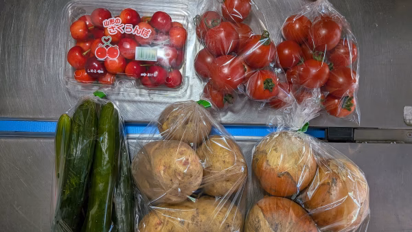 さくらんぼ300g、中玉トマト700g、タマネギ800g、キュウリ600g、ジャガイモ1.1kgの詰め合わせです。
