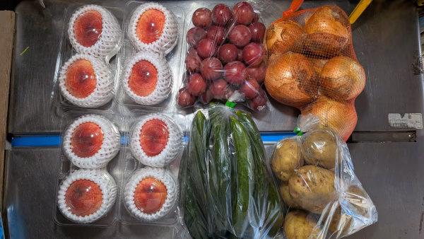 桃1.4kg、赤すもも1kg、ジャガイモ1.4kg、タマネギ1.4kg、キュウリ1.4kgの詰め合わせです。