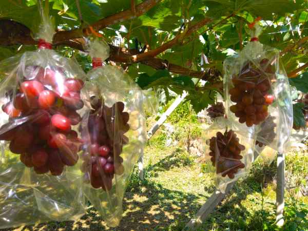 元々小粒小房で、その分味が凝縮される品種です。このため畑面積当たりではシャインマスカットの半分も取れない計算です。しかし作る手間は一房は一房で、このためキロ単価はそれなりにと御理解頂ければ幸いです。