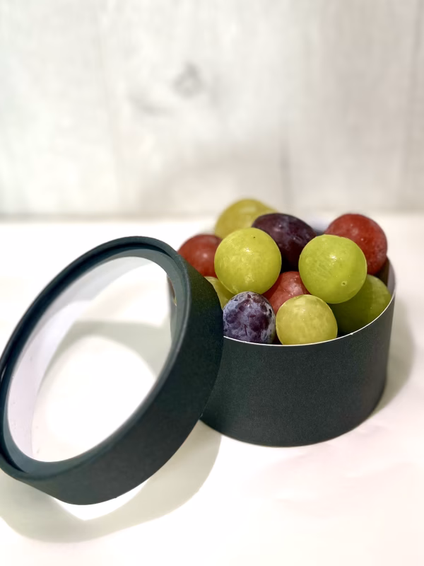 泉州パープル、クインニーナ、サニードルチェ、シャインマスカット、雄宝、クイーンセブンなど、色とりどりに詰め合わせて化粧箱に入れさせていただきます。1箱につき2カップ詰めてお届けします。