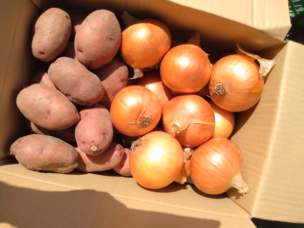 - ジャガイモは日に当たると、変色します。 必ず 陽にあたらないよう米袋か段ボール箱のふたをした状態で涼しい所に保存してください。 玉ねぎは風通しの良い日陰に保存してください。