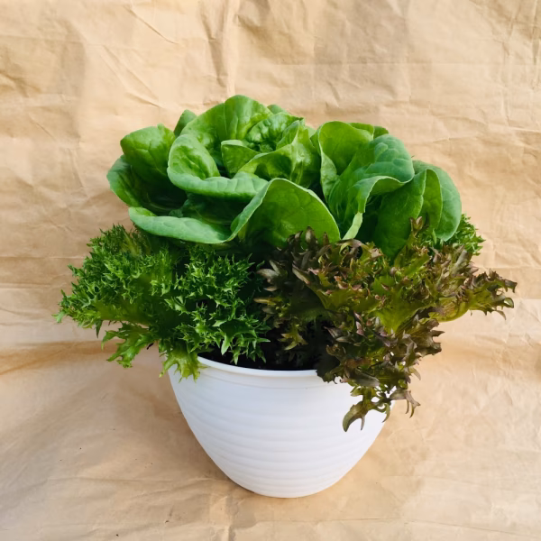 こちらの商品は2種類のレタス4株とサラダ菜1株の花束のような寄せ植えです。ゆっくり眺めながら育てながら新鮮野菜が楽しめます。