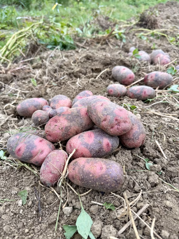 品種名「デストロイヤー」 農薬、化学肥料を一切使用せず、自然の栄養のみで育てました。 しっとり系よりはホクホク系。料理中の扱いは男爵イモに近く、切る・茹でる・炒めるといった作業がしやすいのが特長です。 煮崩れしにくいため、煮込み料理に向いています。大きくゴロゴロに切り、ポトフに入れると、ホクホク食感を活かした仕上がりになります。 炒め物との相性も良く、ベーコンやにんじんなどと合わせたジャーマンポテト風の料理にぴったり。仕上げに粉チーズやケチャップを加えると、コクのある味わいになります。 形や大きさにばらつきがありますが、それも自然栽培ならではの魅力の一つ。素材の風味を活かしたい方におすすめの品種です。 【ちょっぴり豆知識】 インパクトのある品種名は、見た目が覆面レスラーのように見えることから、実在したレスラーの名前にちなんで名付けられたそうです。 ▼訳アリ品表記について 今年は植え付け時期が例年より約1ヶ月ほど遅延したことで、収穫は7月上旬となりました。 猛暑時期の収穫のため、芋によっては発芽しやすい場合がございます。 そのため、今回お届けするジャガイモは「訳アリ品」として、出品しています。 出荷時点で芽が出ていないものを選別してパック詰めしております。 ただし、配送中や保管中の温度環境によっては、お届け後に発芽が始まる可能性があることを、あらかじめごご理解の程お願い致します。 調理の際は、もし芽が出ていた場合にはその部分を取り除いてからご使用いただければ問題ありませんが、できるだけ早めにお使い下さい。 自然栽培による旬のジャガイモ、ぜひお楽しみいただけたら幸いです。 ▼内容量について 商品の総重量は、梱包材を含みます。 内容量の個数は目安です。