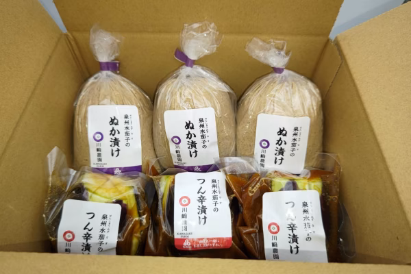 - 泉州水なすぬか漬け 名称:水なす漬物/原材料:泉州水なす(大阪産)/漬け原材料/ぬか、食塩、昆布(北海道産)/ミョウバン 原料原産地名:貝塚市産(水なす) 泉州水なすつん辛漬け 水なす漬物(つん辛漬け)/原材料:泉州水なす(大阪産)/漬け原材料/ 醤油、砂糖、穀物酢、からし粉/着色料(ウコン)、原材料の一部に小麦、大豆を含む) 原料原産地名:貝塚市産(水なす)