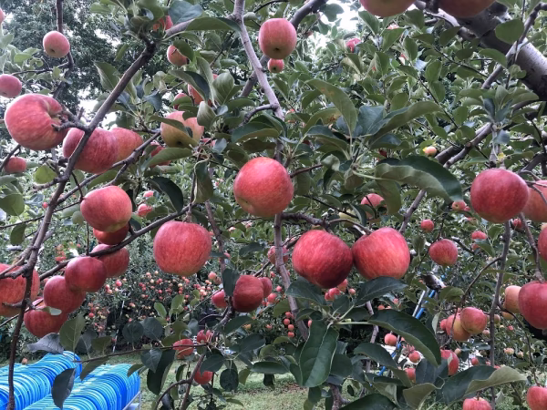 青森県は南八甲田の麓に位置する当園は、冬は雪深くりんご栽培も大変ですが、その豊富な雪解け水と、昼夜の寒暖差で、実がギュッとしまった美味しいりんごが獲れる地域です。