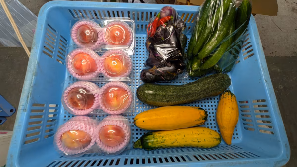 桃、ナス、キュウリ、ズッキーニ