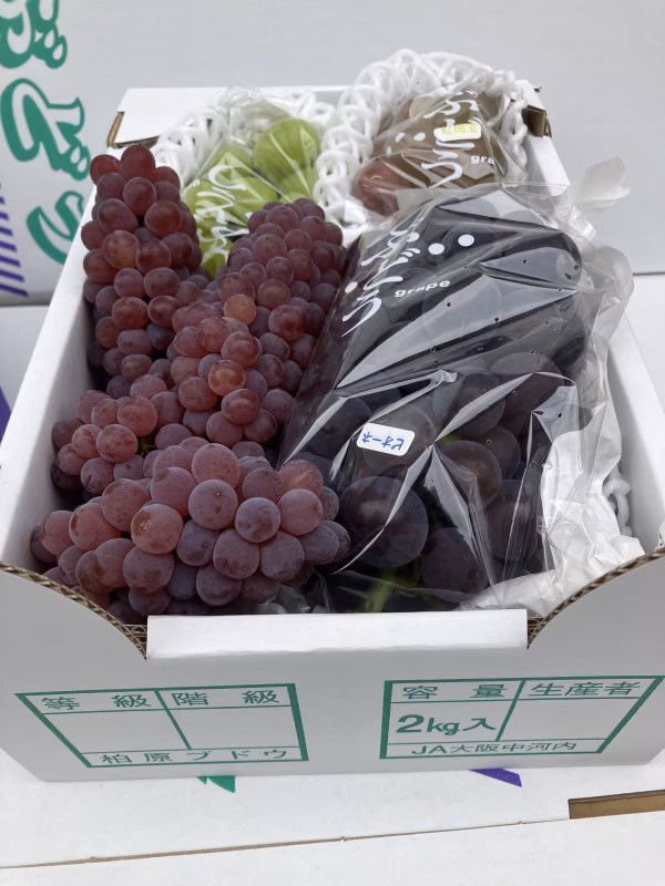 ▼自己紹介 大阪柏原市で夫婦二人三脚で、丹精込めて育てています。 時間差で長期間、熟したぶどうをお客様に届ける為に、ハウス栽培と露地(ロジ)栽培を行っております。 ▼味の特徴 シャインマスカットは黄緑系、紅瑞宝(ベニズイホウ)は赤系、ピオーネは黒系の最高峰。全て種無しです。 デラウェアは屋外の畑で自然に近い環境で作られているため、ぶどう本来の味が楽しめます。栽培期間が長くなることから太陽の光をめいいっぱい浴びて熟しています。 いろんなぶどうを食べたい方にオススメ。 シャインマスカット紹介(種無し) 瑞々しい果肉とスッキリとした甘みが特徴的。皮ごと食べると....『パリッ❗️』とした食感も楽しむことが出来ます。紅瑞宝(ベニズイホウ)は赤系、ピオーネは黒系、いろんなぶどうを食べたい方にオススメ。 紅瑞宝紹介(種無し) 実が紅く、果肉は瑞々しく、宝石の名が相応しい、当園1番人気。一度食べたら止まらない中毒性があり、あっという間になくなります。 ピオーネ紹介(種無し) 巨峰とマスカットの交配種。大粒のダイヤと呼ばれるように、巨峰の濃厚な甘みとマスカットのギュッとした締まりが特徴です。 デラウェア紹介(種無し) 8月9日現在の糖度は23度前後。甘味と程よい酸味がクセになります。小粒で種なしため、お子さまにも食べやすいサイズです。 ▼数量、分量の目安 それぞれ500g程度ですが、生育状況によっては500gを切る場合があります。合計では2kgは確保しています。 ▼栽培方法/大阪エコ農産物認証 大粒ぶどうはハウス栽培、デラウェアは路地栽培 令和7年3月26日認証 大阪エコ農産物生産計画認証番号070122A13 ぶどう 農薬・科学肥料 5割減 ▼複数同時注文割引について 2箱を注文の方へのサービスとして、2箱目を1割引させて頂きますので、是非ご検討下さい。 ▼注文に際しての注意点(配送方法や納期指定など) 完熟状態のため、配送時に粒がとれる恐れがあります。梱包前は全て房についた状態でフルーツキャップをして配送しますので、ご理解・ご了承いただきますようお願いします。 ▼食べる際の注意点 ぶどうの皮には栄養が詰まっていることから、甘い中身と一緒にお召し上がりになる方もおられます。私たちぶどう農家もそのまま食べることが多いです。 しかし、紅瑞宝、ピオーネの皮は渋みや苦味があることから、食べる際にはご注意いただきますようお願いします。