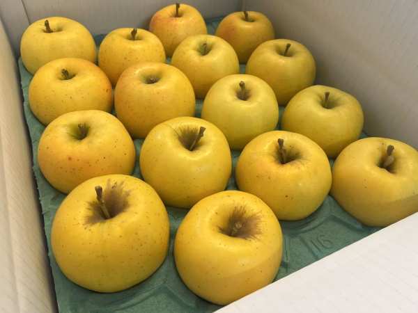 大玉な黄色いりんご「もりのかがやき」です。もりのかがやきは、糖度が高く、酸味もほとんど感じませんが、果汁が豊富なので、甘いのにサッパリとした食味です。