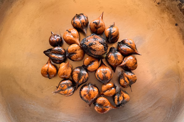 ⑤割れた継ぎ目に包丁、またはマイナスドライバーを入れて割ります。竹串などを使って実を取り出してください。