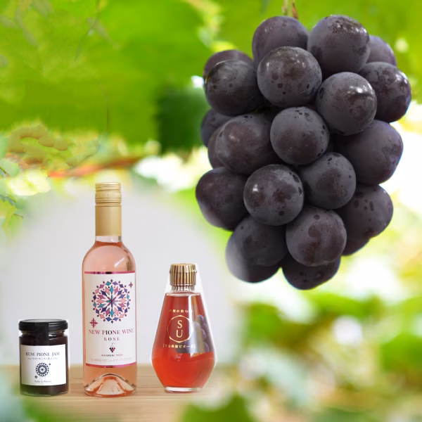 この商品は、花笑み農園で人気がある、ニューピオーネとラムピオーネジャムとピオーネワインと飲む酢のセットです。ニューピオーネ1房とラムピオーネジャム1本とピオーネワイン1本と飲む酢ピオーネ1本入りでお届けいたします。