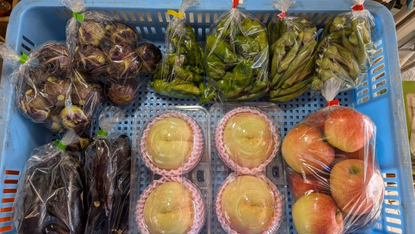 桃1.4kg、リンゴ1.4kg、丸ナス1kg、長ナス700g、ピーマン250g、オクラ500g、シシトウ100gの詰め合わせです。