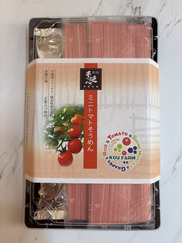- 原材料名:【麺】小麦粉(小麦(熊本県産))、食塩、ミニトマトジュース、食用植物油(大豆を含む)、打粉(澱粉)/紅麹色素、コチニール色素、香料 【つゆ(銀パック)】しょうゆ(本醸造)(国内製造)、砂糖混合異性化液糖、砂糖調整品(砂糖、果糖、デキストリン)、かつお節エキス、食塩、醸造酢/アルコール、調味料(アミノ酸等)、酸味料、カラメル色素、甘味料(カンゾウ)、酢酸、ビタミンB1(一部に小麦、大豆、さばを含む) 製造者:有限会社肥後そう川 販売者:コウ農園 賞味期限:麺2年(常温保存) 開封後は賞味期限に関わらず、お早めにお召し上がりください。 ※本品製造工場では「そば」を含む製品を製造しています。