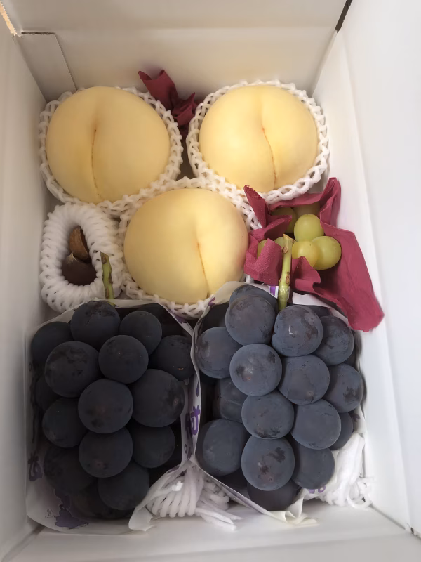 - ピオーネ 召し上がる直前に水洗いして下さい。 すぐに召し上がる場合には房のままの冷蔵でも大丈夫ですが、数日かけて召し上がる場合には出来るだけ洗わずに枝を数ミリ残して粒に切り落としての冷蔵保存をお勧め致します。冷凍の場合には切り落とした粒を水洗い後、水分をしっかり切ってから、平らに並べて保存をお勧めします。 桃 朝採れの桃の為しっかりした桃です。すぐにお召し上がり頂けますが、柔らかい桃がお好みの場合には追熟して下さい。追熟は常温で行いその後冷蔵庫にて保管が1番お勧めですが、桃はとても傷みやすい果物ですので出来るだけ早く召し上がって欲しいです。