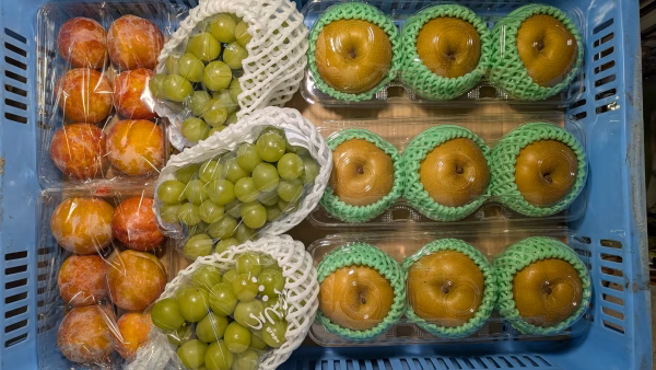 梨の品種は、幸水、ほしあかり、豊水の何れか又混合になります。シャインマスカットは粒ぞろいがイマイチのB級品です。李の品種は秋姫ですが、追熟が進行しており柔らかくなったものがあります。家庭用の商品ですので、価格はリーズナブルに設定しております。